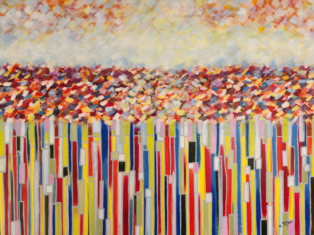 Travelling around in a city CBD during wet, windy autumn days I saw the colour and shapes of the city reflected onto wet roads, building windows and footpaths. Always present, the shapes of autumn were indelibly masked from year to year and this painting is my memory of such beauty.