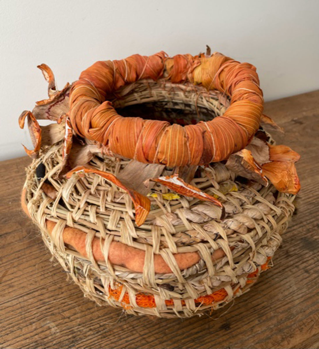 I have been weaving and stitching with natural fibres since I joined Basketmakers of Victoria in 2004 . I am interested in the many plants that can be used for the craft and the way plant materials lend themselves to different shapes. Since moving to Aireys Inlet 16 years ago I have been studying the local vegetation and my garden has expanded to include grasses, vines and leaves that I can use to make baskets. I have also experimented with other materials and textures like bread bags , fabrics , cane and paper dress patterns . Basketmaking has become a passion and I have taught and exhibited my work on many occasions.