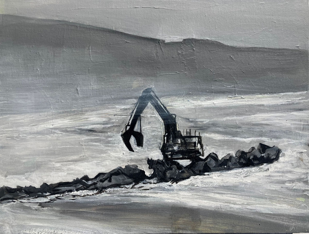 I watched with interest the progress of the Groynes being built whilst on day to day walks along the beach with my Dog. Occasionally stopping to sketch the activity, I noticed on one particular day when the sea mist and mountain mist met over the Groynes. The black silhouette of the excavator against the bright sunlight through the mist made it look almost pre-historic, a monster rising from the depths and walking along the Groynes. I wanted to convey this idea in a small sketch on canvas by simplifying the content and using only tonal, lights and darks.