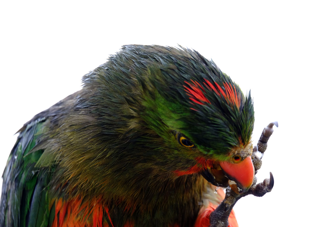 A juvenile male feeding on an almond on a rainy day.