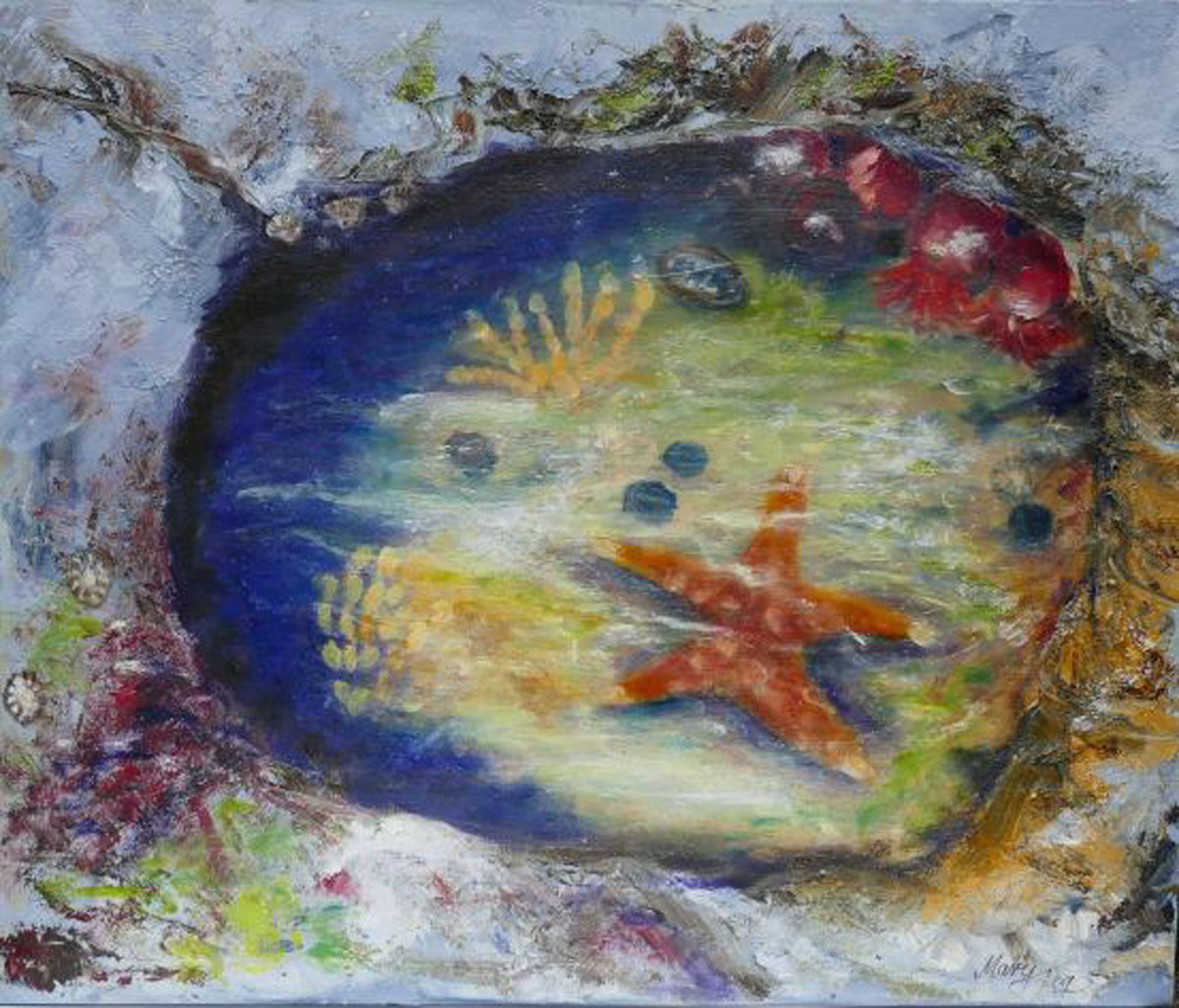 I love exploring rockpools and have painted many as well as created prints of rockpools . In this one , I used several photo references of pools and sea creatures which I have photographed over the years . I concentrated on capturing the texture of the rocks and then used many layers og glazing gel to create the transparent water