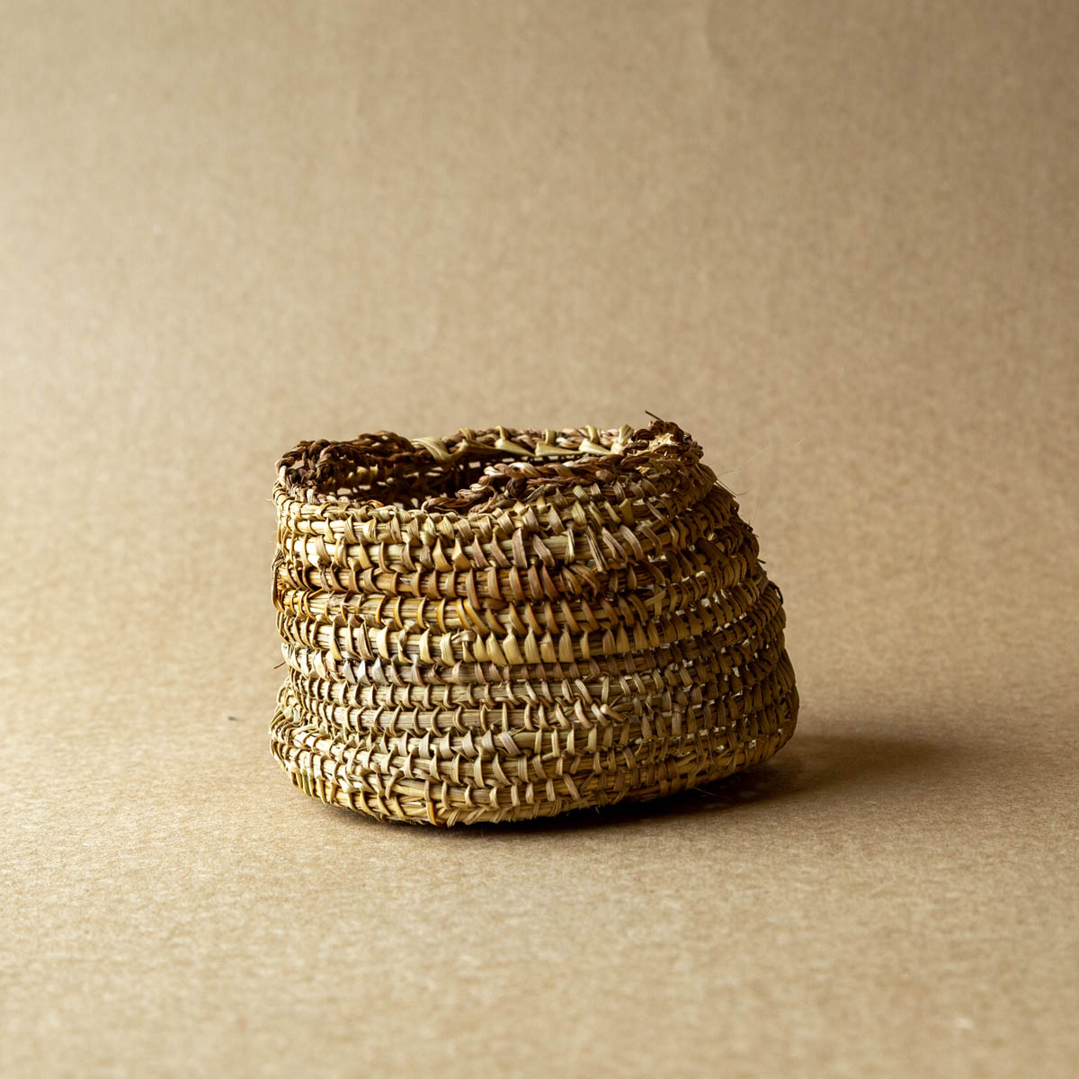 This basket evolved as I sat near Skenes Creek one day waiting for a friend and enjoying the late Summer sunshine. The twisted twine loosely laid in the 3 strands at the top of the vessel is made from the invasive but cheery range Watsonia creeping in from her neighbours yard.