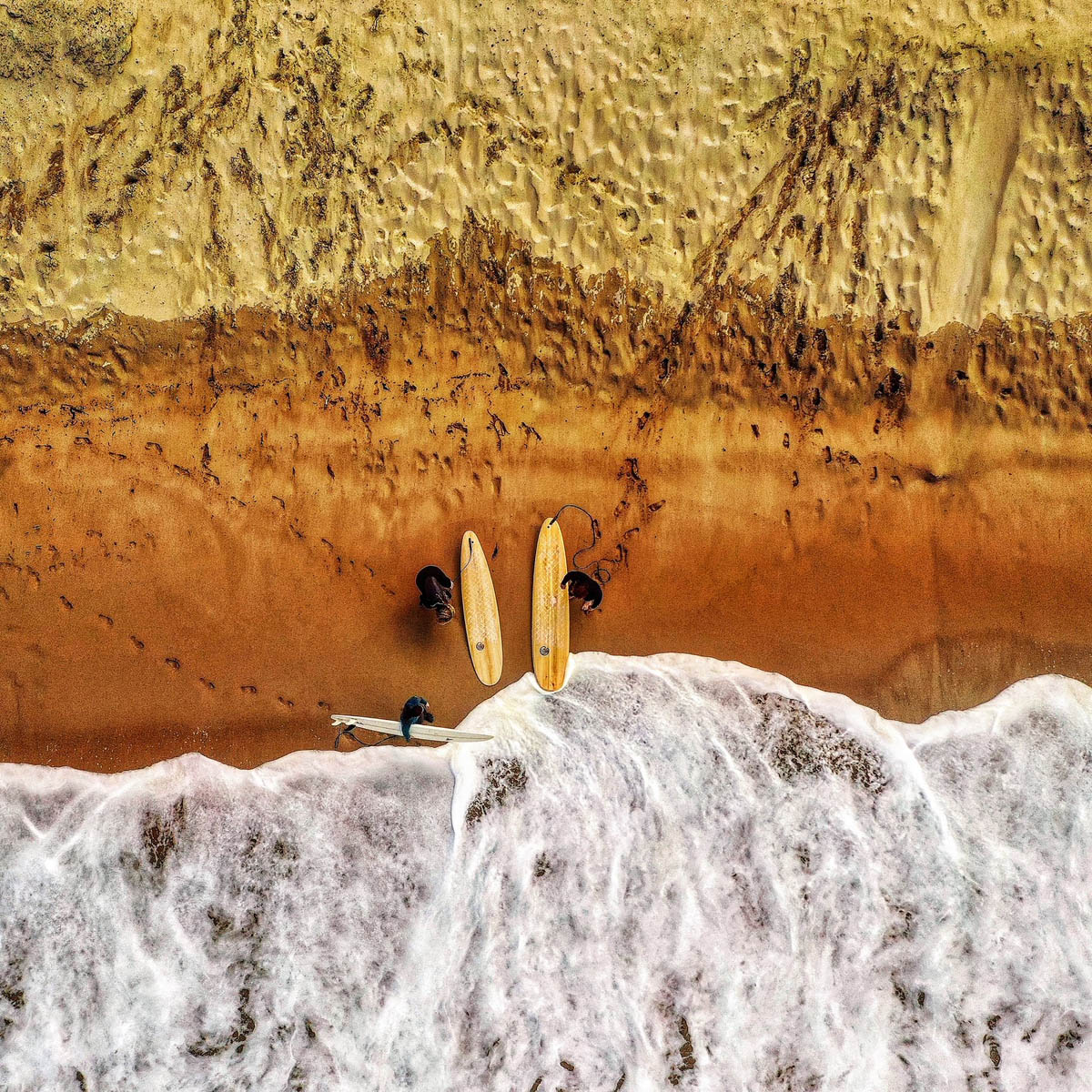 Drone photo of surfers about to head out into the ocean.