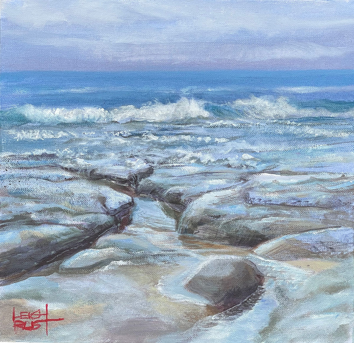 I created this after a family holiday at Point Lonsdale where I spent each morning painting the waves and gathering references before my family woke. I was intrigued by the patterns of the rock shelves with the waves breaking in the distance.